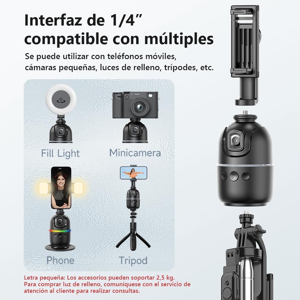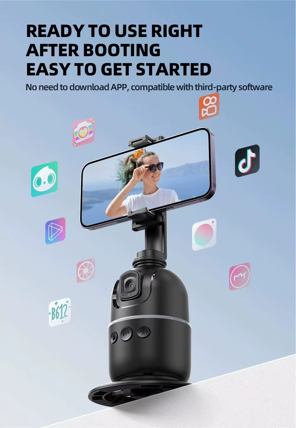 الحامل مزود بشريحة AI ذكية تتابع وجهك أو جسمك أو حتى إيدك بكل سلاسة. مهما تحركت، الكاميرا تدور وراك 360 درجة بدون ما تطلع بره الفريم.